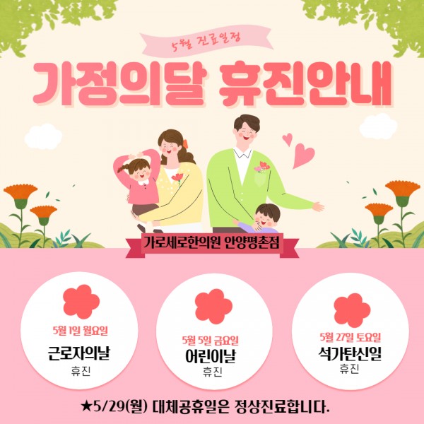 돌아오는 5월, 가로세로한의원 안양평촌점의 휴진일을 공지합니다.