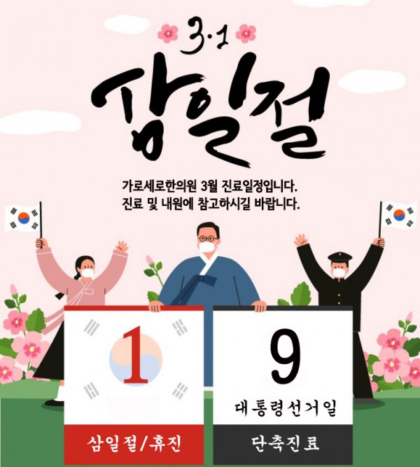다가오는 3/1(화) 삼일절은 원내 휴진입니다.