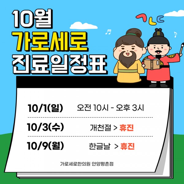 10월 가로세로한의원 안양평촌점, 공휴일 휴진 안내