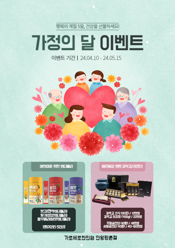 4월 10일부터 5월 15일까지 가로세로한의원에서는 가정의달 맞이 이벤트를 시행합니다.