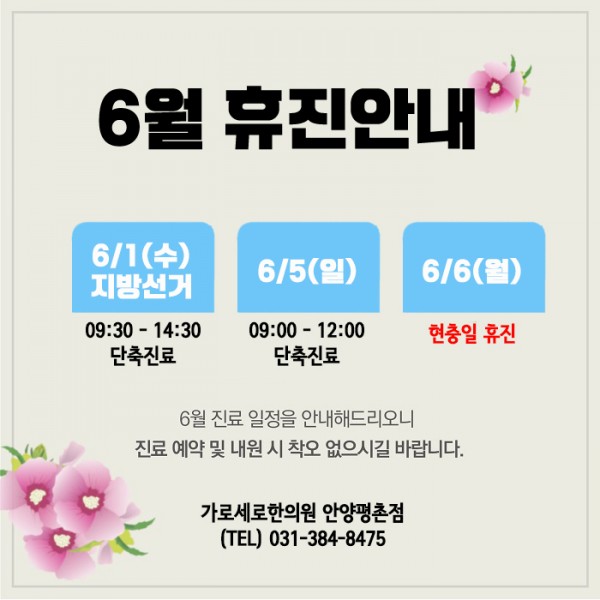 가로세로한의원 안양평촌점 6월 진료일정 안내